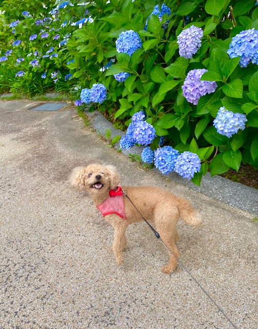 この時期は紫陽花がとっても奇麗に咲いています✨ ライト君、記念に1枚撮ろうか📷